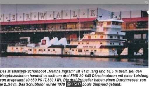 Das Mississippi-Schubboot „Martha Ingram“ ist ein Dreischraubenschlepper und hat eine Länge von61 m lang und eine Breite von 16,5 m.